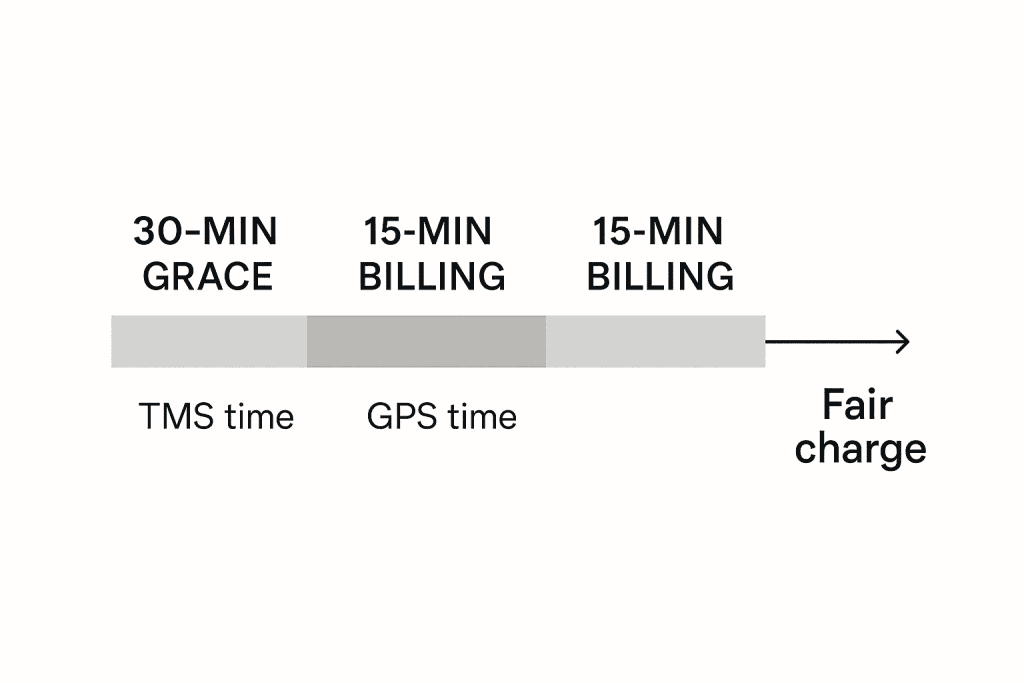 • Pull time from TMS events + GPS timestamps to bill fairly to the minute.